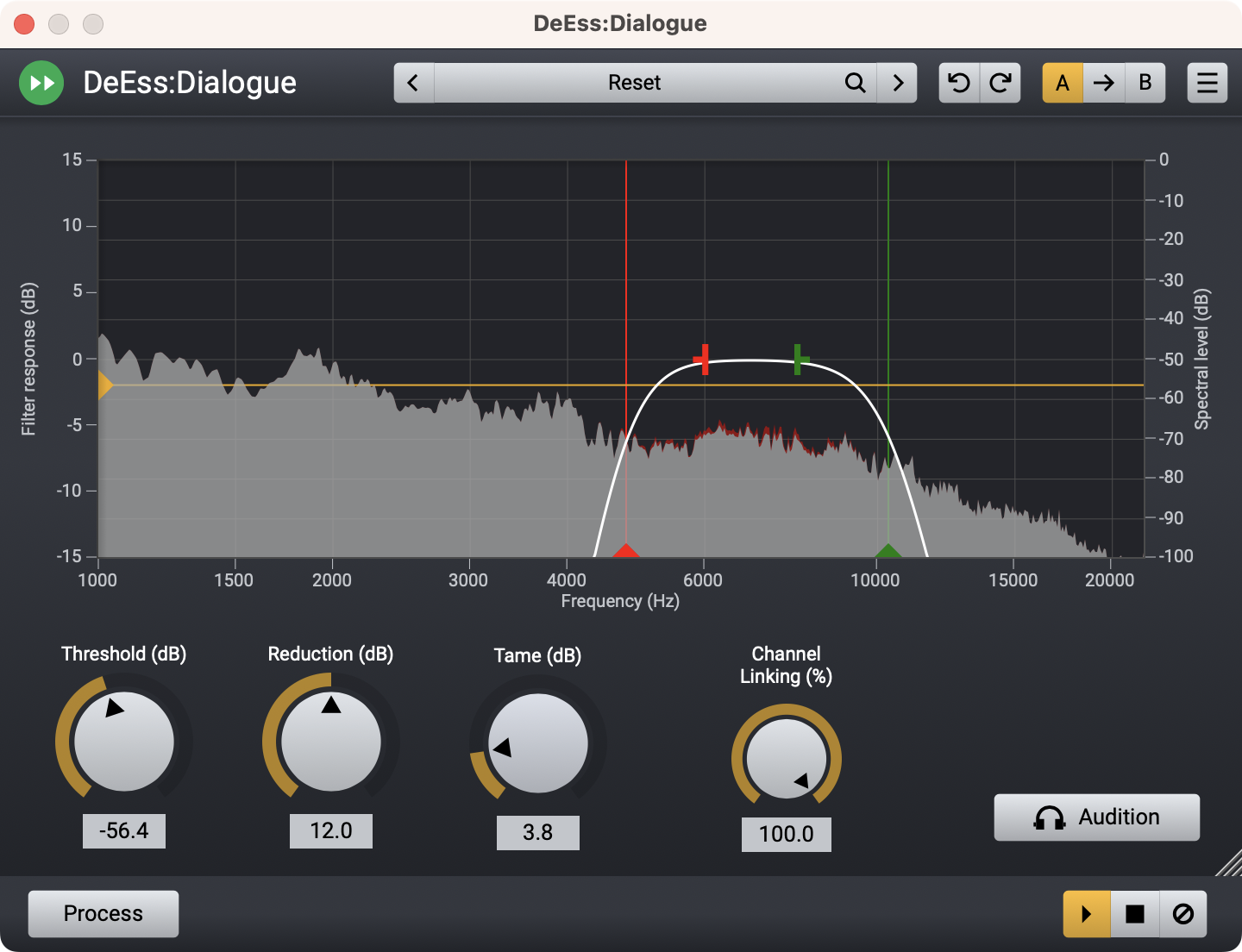 Setting the frequency range is done with an intuitive EQ style interface with two slope adjustable “bands”. DeEss:Dialogue has classic threshold and reduction parameters. It also has a handy tame control which can reduce resonant frequencies in your audio.