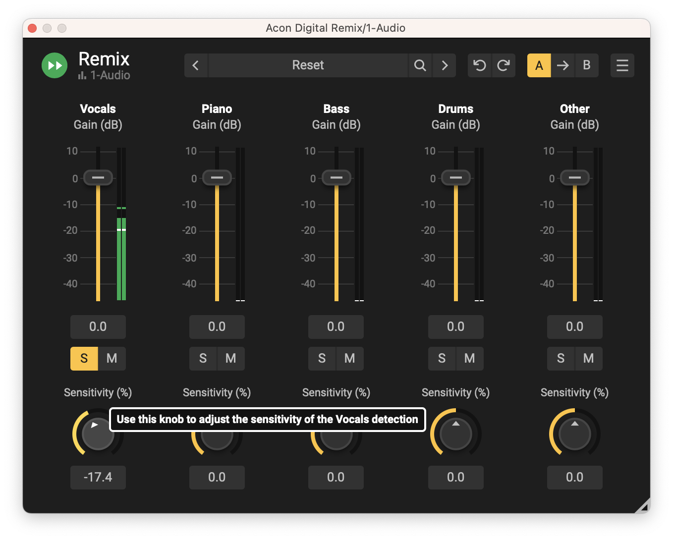 Audio can be separated into five predetermined types of stem: Vocals, Piano, Bass, Drums, and Other. As your DAW plays back you can solo, mute, and adjust the gain of each stem, as well as adjust the sensitivity of the separation on each stem, all in real-time.