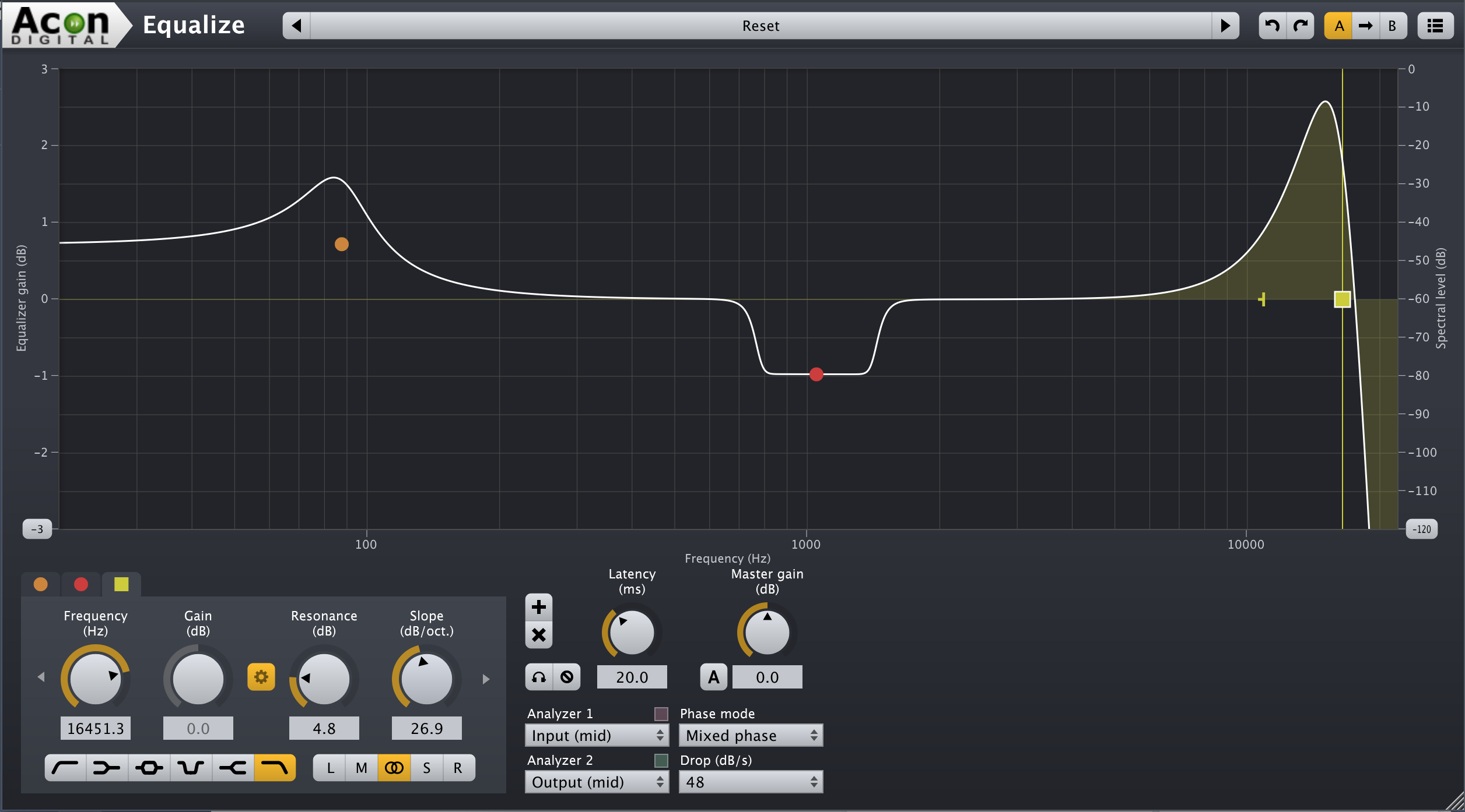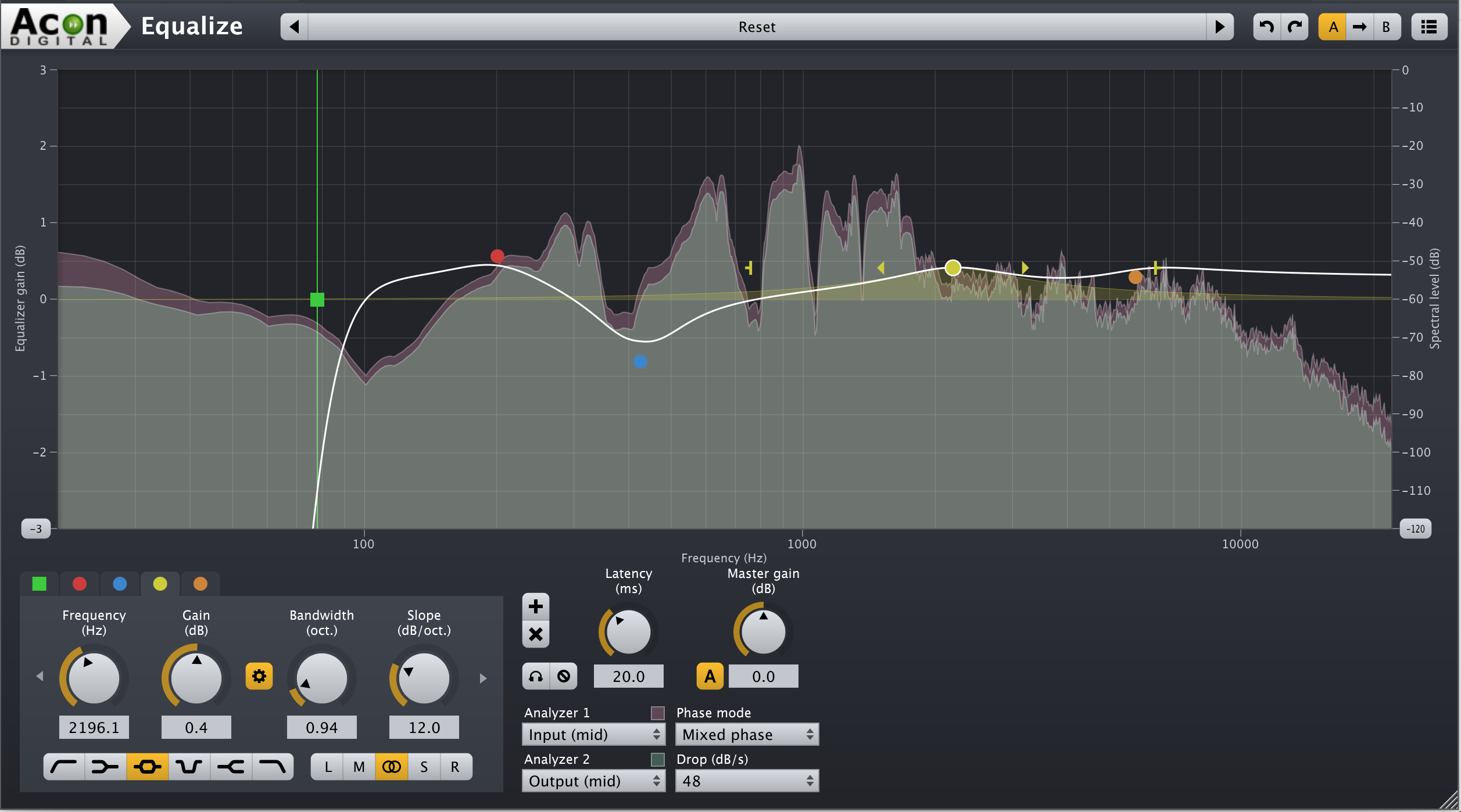 Rounding out our controls are the global functions. The Master Gain output with optional automatic gain compensation is a welcomed addition. Next is the Phase control. Equalize offers three choices here: Minimum Phase, Linear Phase, and Mixed Phase. Minimum Phase behave like analog equalizers. Great benefits are zero latency and no pre-ringing. The downside is you can create phase issues with correlate tracks, for example multiple mics on a drum set. Linear Phase creates no phasing issues at all but at the cost of high latencies and pre-ringing artifacts. Mixed Phase is ACON’s compromise between the two. It combines the best of both and has an additional Latency parameter to adjust up or down according to your needs.