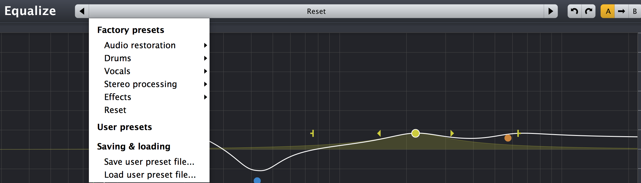 Below the display are the band controls for Equalize and this is where we start to see the inherent strength and power of this plug-in. First off, Equalize allows anywhere from 1-12 bands across the frequency spectrum. An interesting thing about these bands as well: Each band can be any shape the user desires. Available options are Low-Cut Filter, Low-Shelf, Peak aka Bell, Notch Filter, High-Shelf, and High-Cut Filter. 12 bands with this kind of overlap/shaping is useful. Drop a high-shelf on your overheads to boost the sheen, and use the notch filter to get rid of excessive ringing and unpleasant overtones. Or, apply a low-shelf to a boom-y kick drum to get rid of mud and flab and add back a peaking boost at the fundamental to keep the power and size. The possibilities here are extensive to say the least.