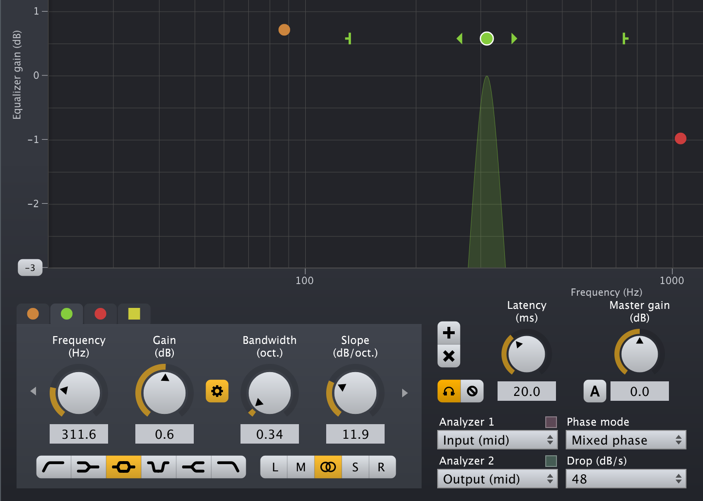 There is also a link between gain and bandwidth which allows users to operate Equalize as a “Proportional Q” equalizer where the bandwidth increases as the gain is raised. Many classic equalizers such as the Harrison and API EQ’s work this way. The final parameter here is Slope, measured in dB/Octave. Effectively, this functions as a rate of drop-off in a selected band filter. Often we only see these as an adjustable setting on high and low-cut filters. Here, every band has a slope control. Combining this with the bandwidth gives users a framework to draw in literally any shape they desire. Shelves with a resonant peak are easy to create, as are peaking filters that are wide, but flat across their given boost or cut. This kind of surgical precision and problem-solving is not always necessary or even musical as it can create artifacts! But when you absolutely need it, it is very nice to have.