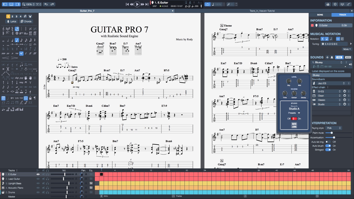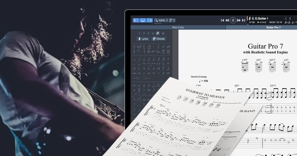 Guitar Pro 7 is a score player helping musicians learn how to play, improve their technique, reproduce their favorite songs or accompany themselves. Guitar Pro 7 allows you to compose and read music scores using the musical notation of your favorite instruments. Display the tablature notation to learn guitar riffs or use the standard notation to read music scores for piano, drums, brass and strings. Slash notation is also included to easily sight-read rhythmic patterns from chord charts. Hit play and the tab automatically scrolls on. A highlighted cursor lets you know which note is being played and the sound engine reproduces all the effects specific to the guitar: pickstroking, fingerpicking, bend, slide and ghost notes.