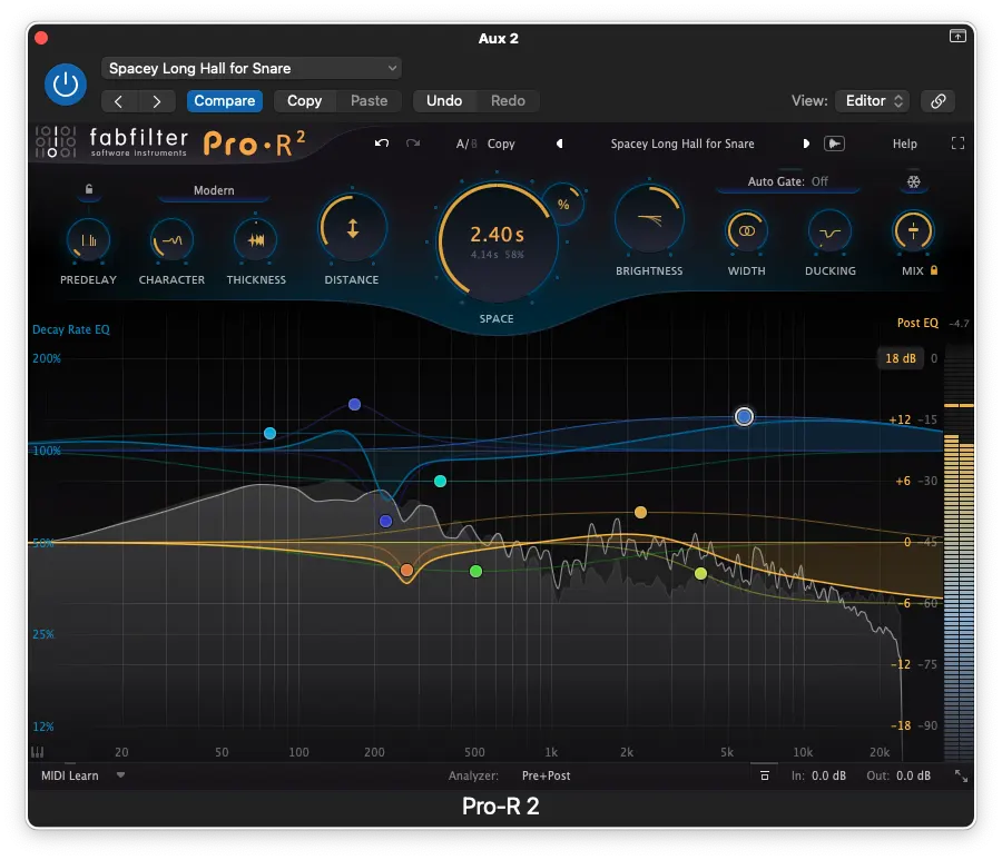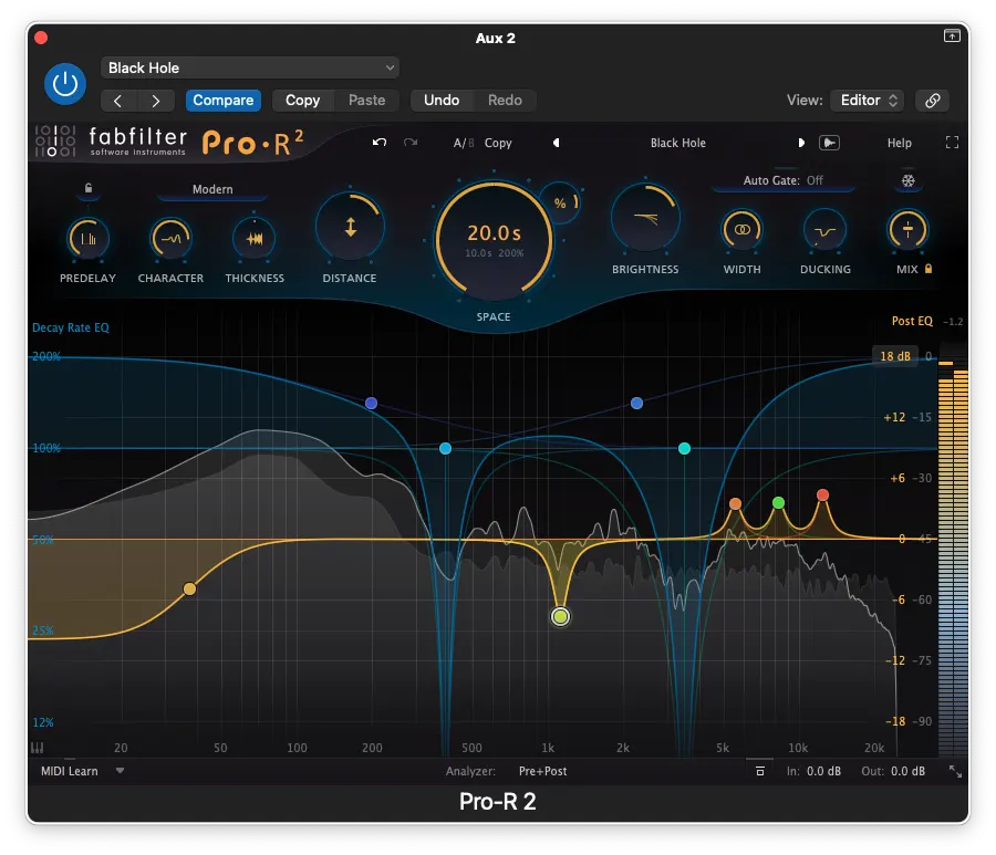 For those of us who are fans of the almost tactile interface shared by many plugins in the FabFilter ecosystem, everything we love is still front and centre. Six bands of parametric EQ can be applied to sculpt the sound of the reverb (the Post EQ, shown in orange) and six additional bands control how the frequencies of the reverb decay in time. These are both overlaid on top of a real-time Analyzer, with selectable Pre and Post views, making it a breeze for even novice engineers and sound designers to tailor the perfect effect for their track in real time.