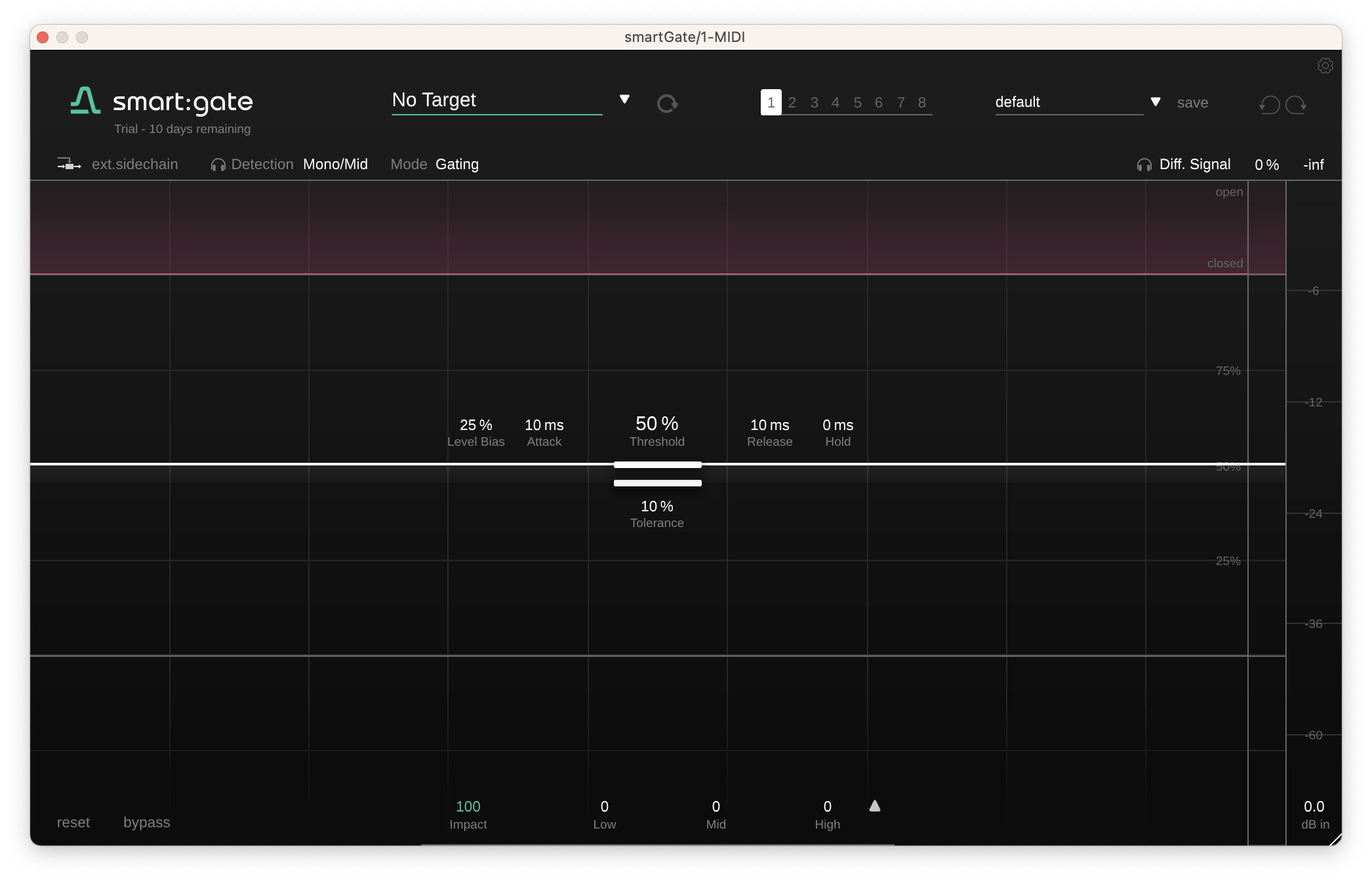 Even more practically speaking, smart:gate has undo and redo, eight different plugin states which can be switched between and copied and pasted, and the ability to solo the difference in signal to hear exactly what you are gating.