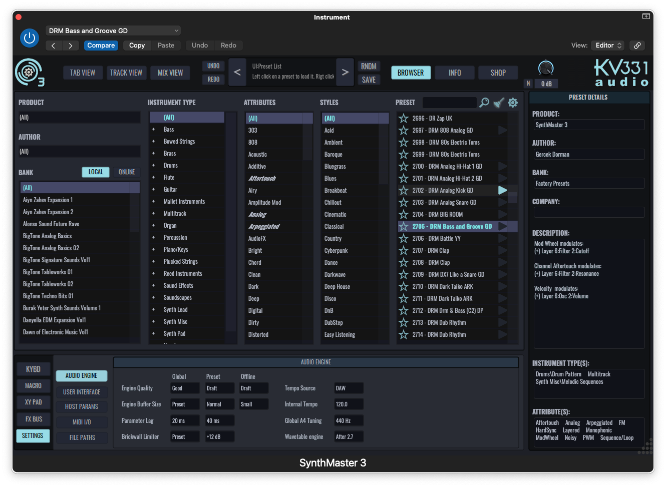 I’ve been exploring SynthMaster 3 for a while now and still feel like I’ve barely scratched the surface. It’s a phenomenally powerful synth that lets you edit waveforms under a microscope and then go on to stack your patches hundreds of virtual oscillators deep if that’s what you’re into. The developers have even been thoughtful enough to include starter patches for all 32 original DX7 algorithms if you’re a fan of that classic FM vibe. The overall sound quality is excellent, and you have five audio engine quality settings to choose from if you’re concerned about CPU load.