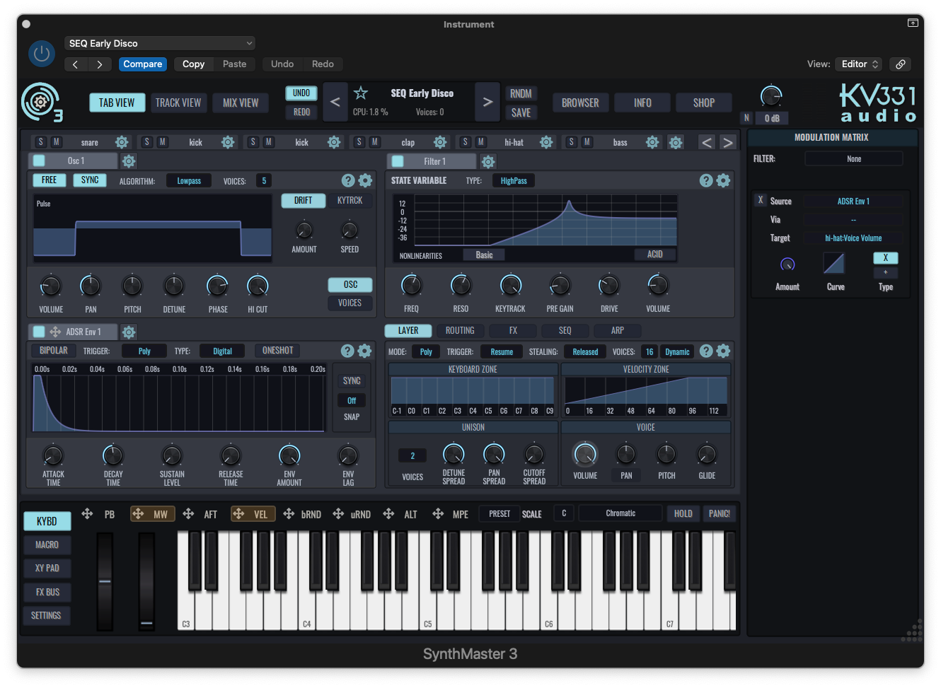 KV331 has really pulled out all the stops when it comes to analogue emulation, down to the smallest details like oscillator drift and multiple voice allocation modes. SynthMaster 3 introduces a new VAnalog Oscillator which renders waveforms by drawing them point to point in real time rather than calling up stored single cycle waveforms. This allows for higher resolution waveforms at lower frequencies compared to the basic oscillators.