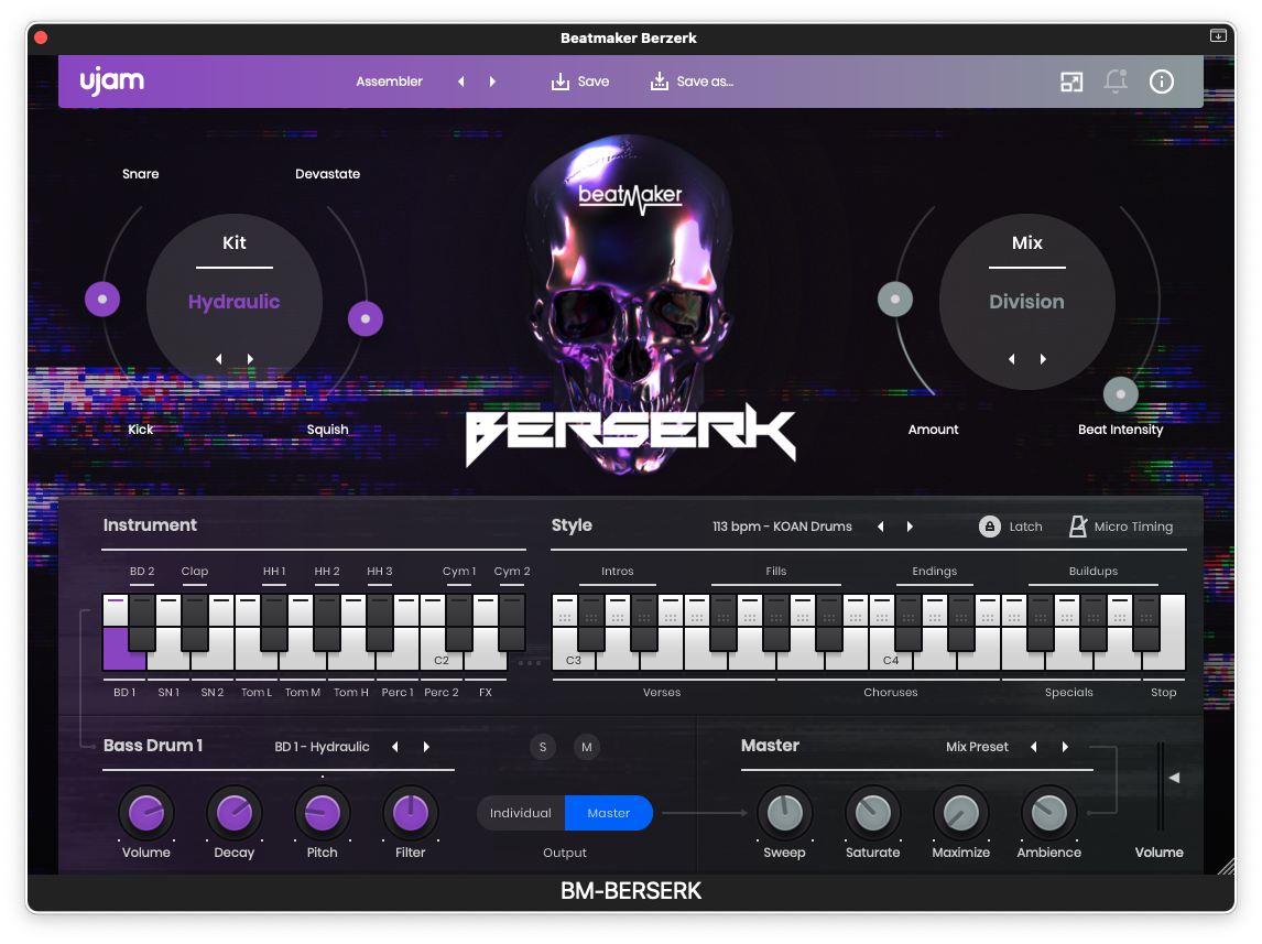 The Beatmaker series consists of 12 Beatmakers, each geared toward a particular musical genre – BERSERK covers Dubstep, COZY does LoFi, IDOL is geared toward K-Pop, and so on. They’re available individually, or all together in the Beatmaker Bundle. Each version has its own selection of samples (organized into 10 preset kits), patterns (organized into groups of compatible verses, choruses, intros, breakdowns and endings called “styles”), and mix processing chains. These kits, patterns and processing chains are grouped into individual presets. That means you can select a single preset if you want to dive right in and start making music when the mood strikes.
