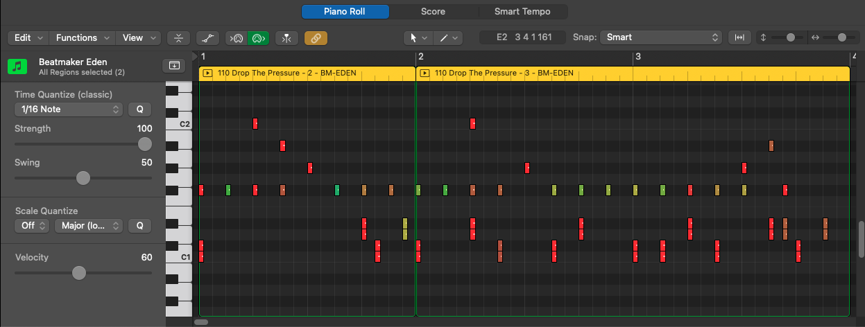 In addition to selecting patterns from the keyboard, Beatmaker also offers a Drag and Drop option for building tracks. Hover over the top half of the style keyboard to highlight the drag area of your preferred pattern, then drag it into the track window of your DAW. This inserts a MIDI region into your track, which you can then place, loop, and duplicate as needed – or edit them to make your own variations. This feature allows you to transfer patterns between Beatmaker versions, or to any other instrument in your DAW.