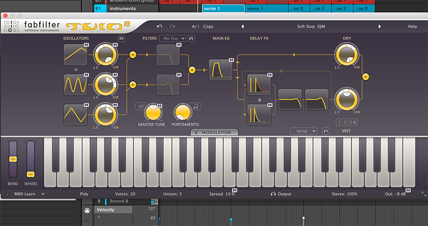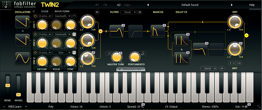 FabFilter's Twin 2 is a virtual analogue synthesizer focused on what-you-use-is-what-you-see. At all times, the interface only contains modulation sources and slots that you are using. This results in an easy to use user interface perfect for users of any level of skill and familiarity with virtual synthesizers. The Twin2 is packed full of amazing features and presets sure to inspire the user to expand their creative capabilities.
