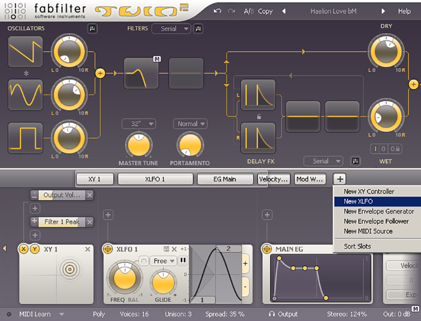 The XLFO is similar to a classic LFO but it can do much more. It can also be used as a 16-step sequencer with an individual glide parameter for every step. The display shows the waveform that is used by the XLFO. Steps can be freely added or deleted to shape the funkiest of waveforms. The XLFO can also be used as an arpeggiator. The values can be equally distributed over 2 octaves, so when connecting it to any pitch parameter, it will function like an arpeggiator. Twin 2 also contains a XY controller that can manipulate two parameters with one mouse movement. Controlling FabFilter Twin 2's parameters directly with MIDI is very easy using the MIDI learn feature. With MIDI learn, you can associate any MIDI controller with any parameter. Click the MIDI learn button in the bottom bar to enter MIDI lean mode. The interface dims and the parameters that can be controlled are highlighted.