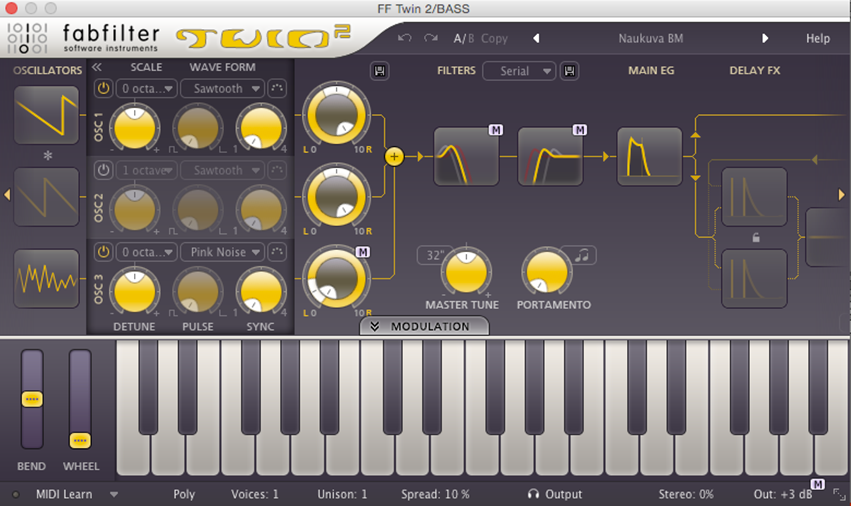 - Three high-quality oscillators with PMW, hard sync, and phase sync.