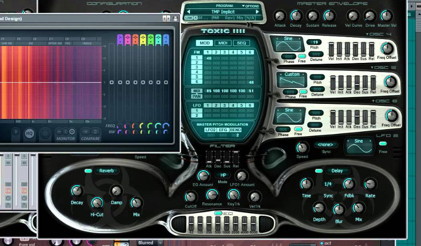 Toxic Biohazard contains 6 Oscillators, each with identical controls and functions. Each oscillator has 4 controls that affect the amplitude of the chosen oscillator: Attack, Decay, Sustain and Release (ADSR). Toxic Biohazard has a powerful filter section. Very reminiscent of a moog type filter. It operates in both LowPass and HighPass modes and has its own ADSR envelope generator as well as accepting modulation from various sources. The Toxic Biohazard sequencer/arpeggiator is highly advanced. It allows for all kinds of rhythmic sequences as well as basic arpeggiation. There are several modes of play for complex patterns. Toxic Biohazard includes effects such as: Delay, Chorus, Reverb, Flanger, Phaser and Lo-Fi. It also includes a high quality 8 band graphic EQ with +/- 18 dB range.