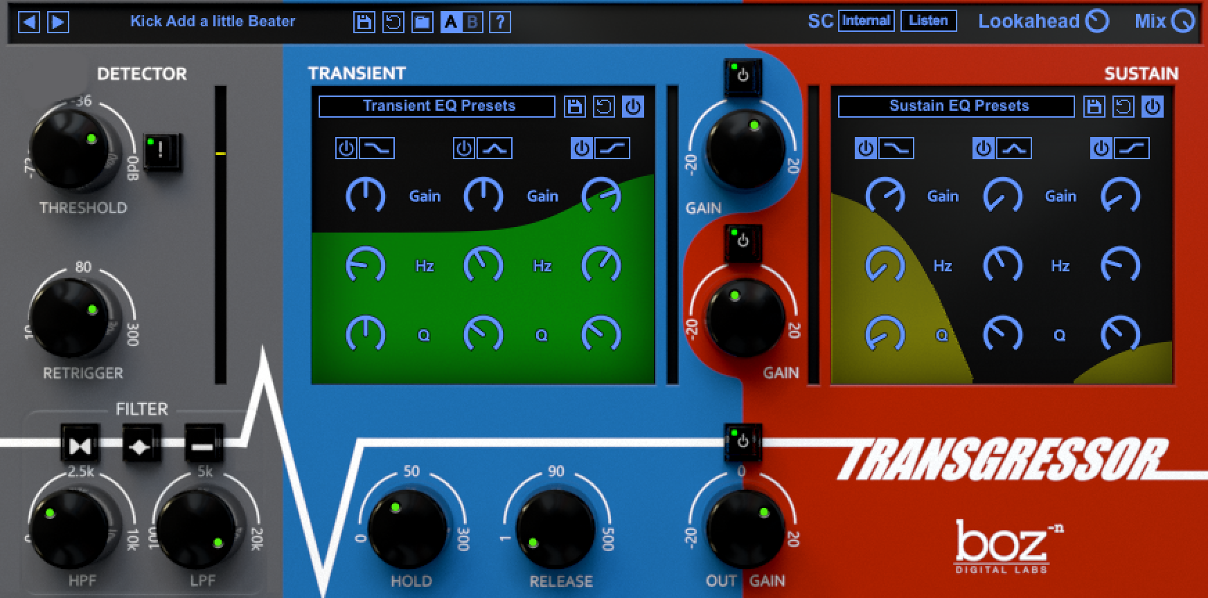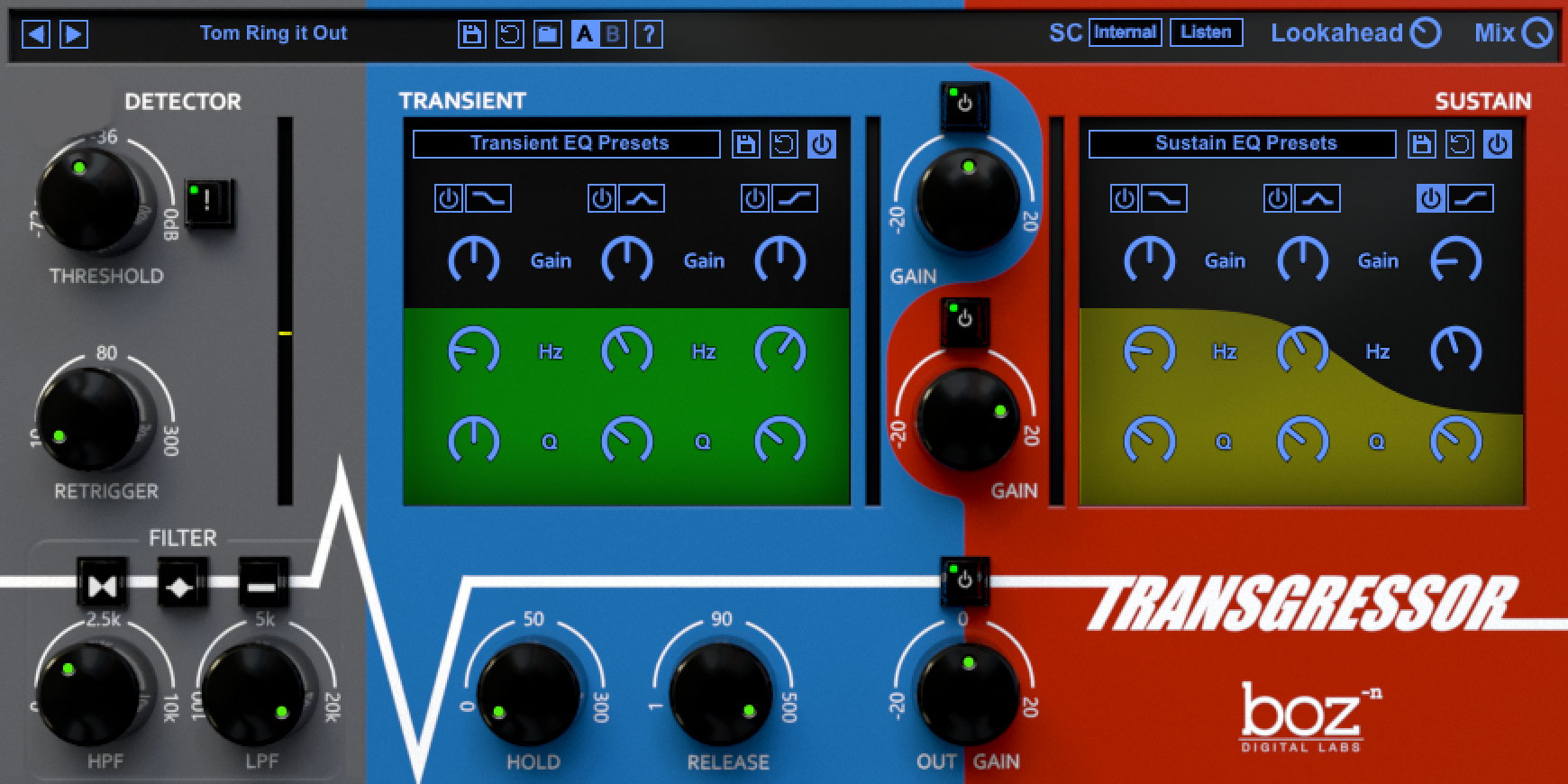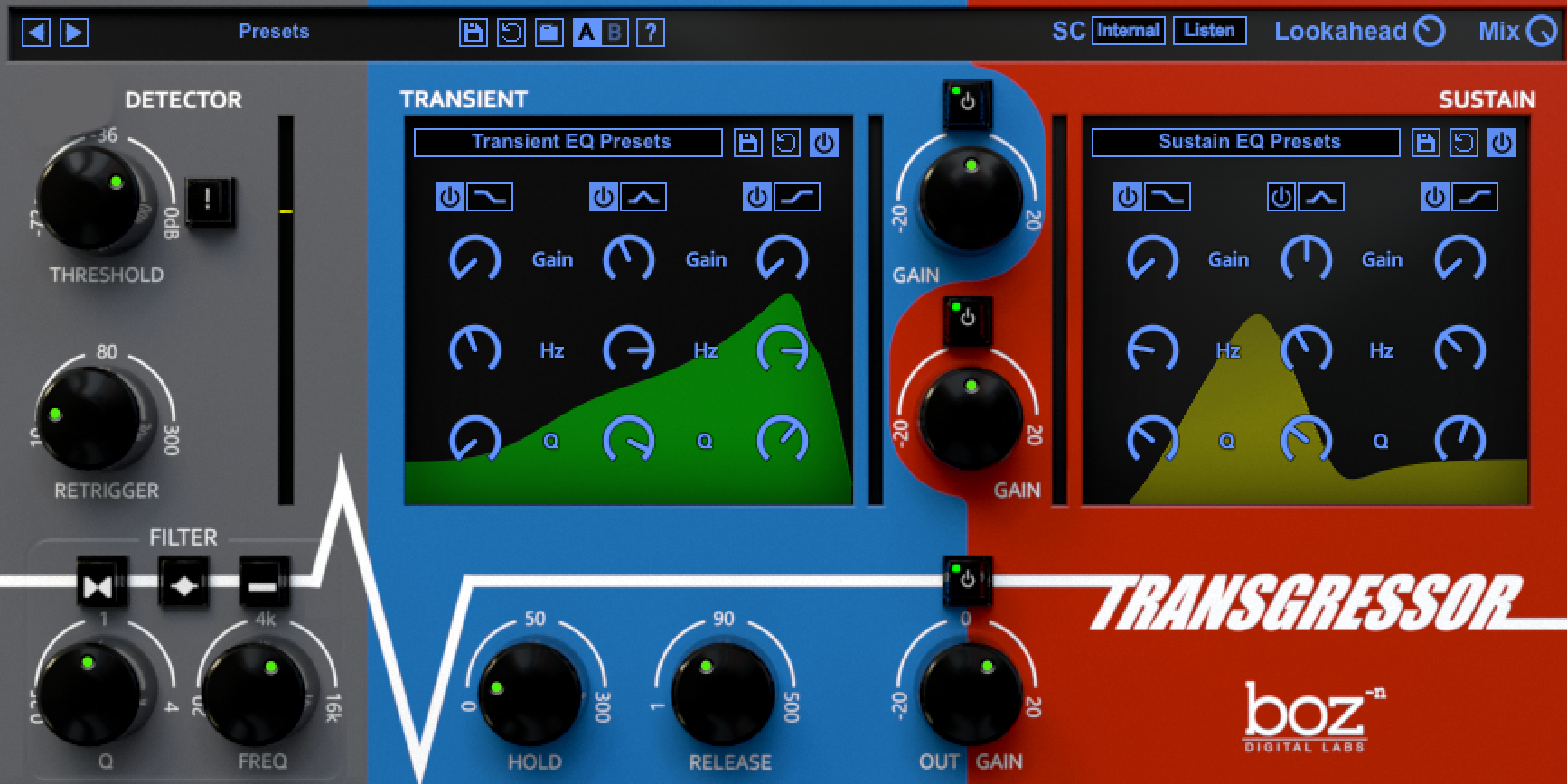 Boz Digital Labs' Transgressor is a hybrid EQ and transient shaper. Giving you separate EQ control over your transients and your sustained sounds, Boz Digital Labs promises that Transgressor is the new standard of transient design. Whether you need to subtly enhance your sound or completely overhaul your sound, Transgressor makes it quick and simple to do so.