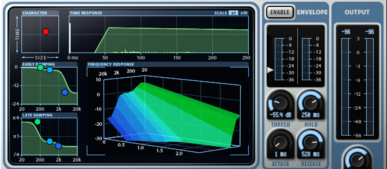 The upper left portion of the interface is our first set of parameter controls and is very useful. Five mini graph displays give users control and visual feedback about the current settings. The first graph is an X-Y axis of Time vs Size labeled “Character”. A novel approach that adjusts both late and early settings simultaneously. Although I wish this were a bit larger, it is a fantastic way to get in the ball park quickly and easily. Underneath that are two windows for damping controls; One for Early Reflections and one for Late Reverb. However, the Early controls do affect the later signal so it’s easiest to think of this as pre/post processing. These effectively act as equalizers for each part of the reverberant signal. They are very effective at changing the overall tonal balance of the two signals, but not capable enough for surgery. This isn’t a slight though as these tone-shapers are highly adept at pulling out the sounds you need and more flexible than many equalizers I have seen included with other reverbs.