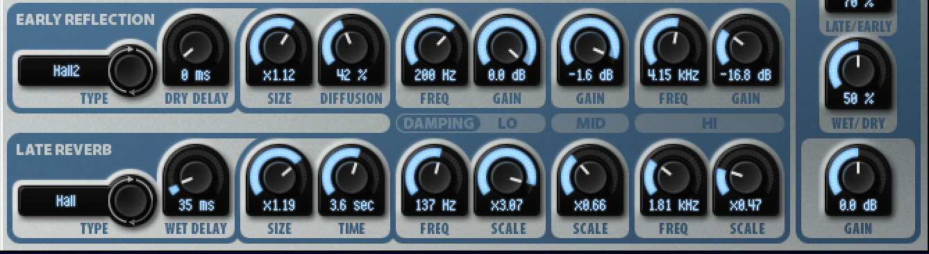 Similar features below control the parameters for the Late Reverb signal, with some small changes. Only two types exist, Plate and Hall, and the pre-delay here is referred to Wet Delay. Size and Time controls are next followed by the post-processing damping equalizer.