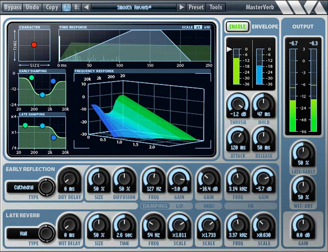 The window for Masterverb 5 is set up similar to many other reverbs. Like all Wave Arts plugins, the top of the window displays the Bypass, Undo, and Copy functions. Right next to those is the dedicated A/B selector switches and the preset menu. Wave Arts makes it easy to store, sort through and compare presets (and by the way…it comes with a ton of presets). The last button along the top strip is Tools, which gives quick access to the manual.