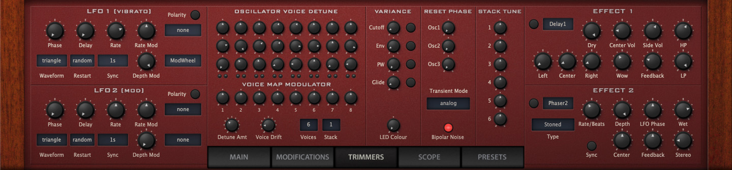 The Trimmers panel is a real treat for analogue afficionados. Here you can use Oscillator Voice Detune to adjust the tuning of each oscillator in each voice, simulating the unique variations among individual voice chips in a polyphonic synthesizer. The Voice Map Modulator lets you map per-voice variations to other destinations as well, like filter or panning. And if that’s not vintage enough for you, the variance controls let you dial in additional randomness to filter cutoff, envelope time, pulse width or glide.