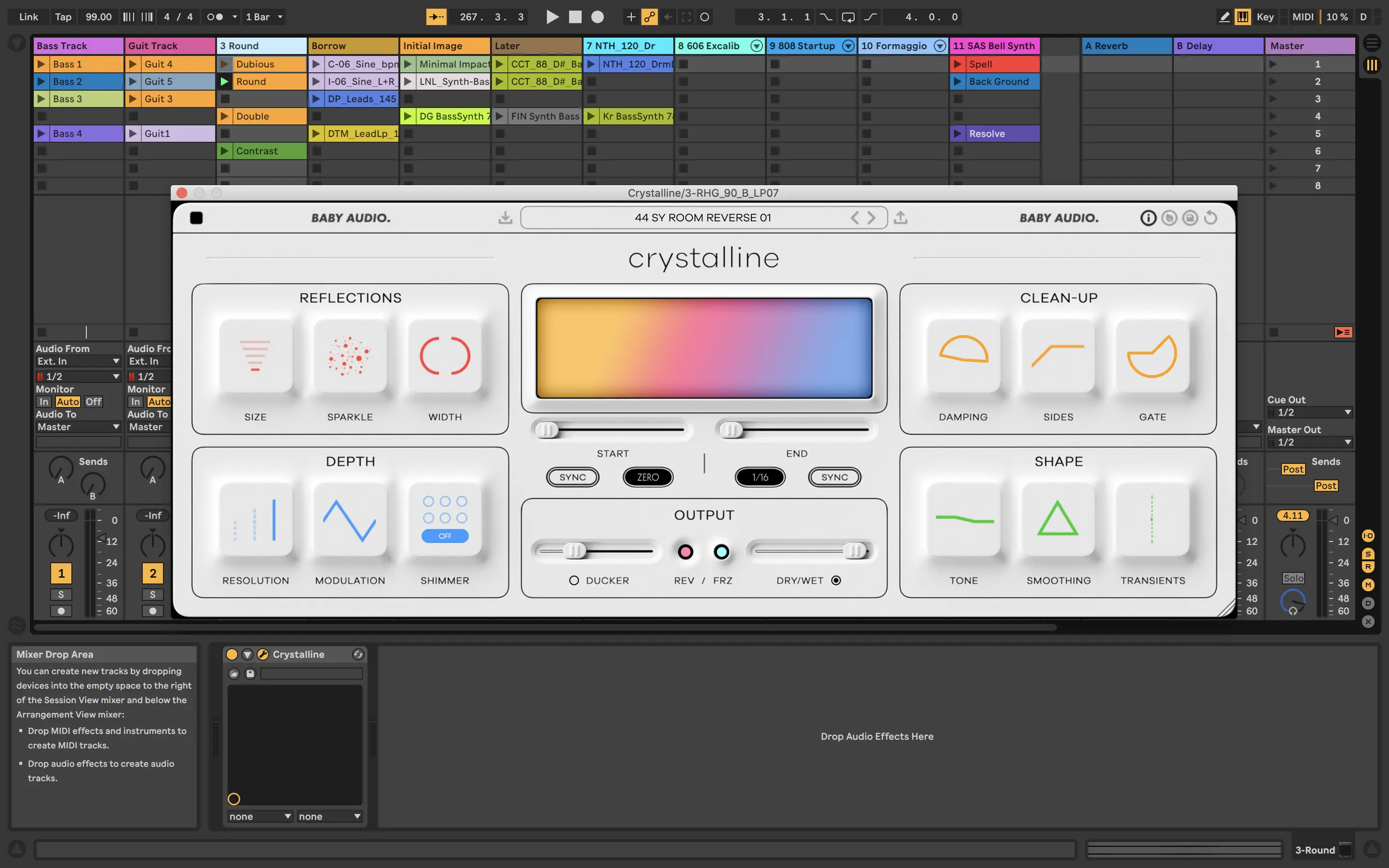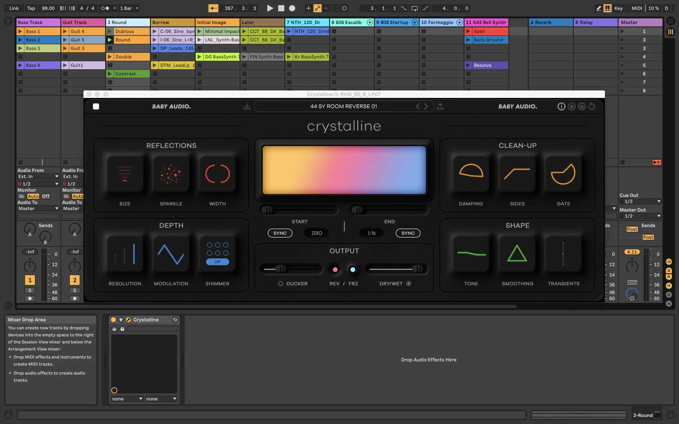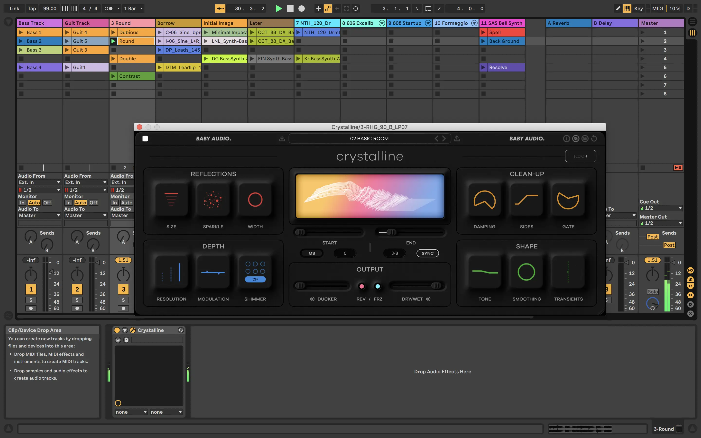 I encountered one D.A.W. crash when I was flicking quickly through the resolution settings in Crystalline. According to Baby Audio Documentation this setting changes how the processor is addressing the data, so doing very quick changes like I did was perhaps unwise. My Ableton session allowed a reload without issue after a hard reboot.
