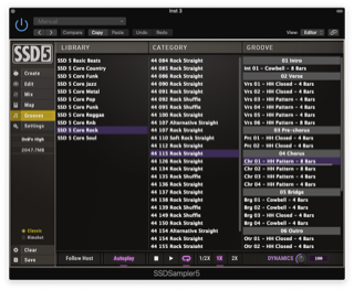 If you prefer a professional studio drummer’s playing to your own, SSD 5.5 comes with over 2,400 MIDI grooves with a groove browser incorporated into the plugin making it easy to audition grooves before dragging and dropping them into your DAW. Pop and rock styles are particularly well represented, but the selection includes country, funk, jazz, metal, punk, RnB, and soul, with each song selection offering plenty of intros, fills, variations and outros to keep things sounding fresh. The grooves have a very live and dynamic feel, making them a great way to audition the various kits.